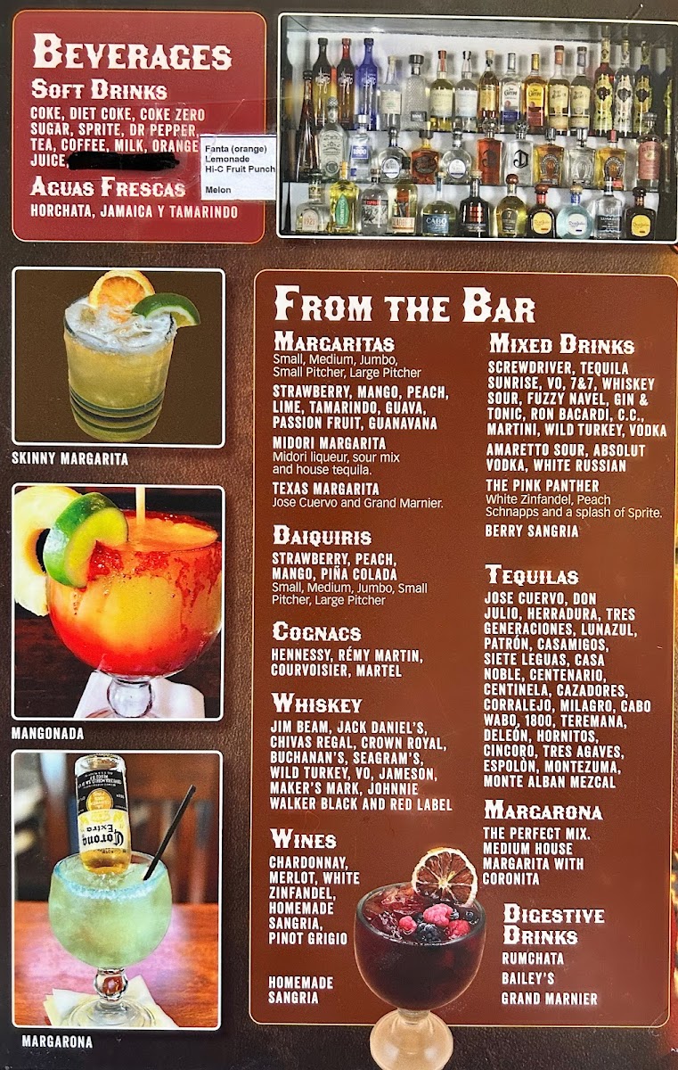 The menu features a variety of traditional Mexican dishes along with options from a fully stocked bar. Food selections include seafood items such as shrimp cocktail, ceviche tostadas, and grilled shrimp with garlic, typically served with accompaniments like rice and pico de gallo. Several fajita options are available, including beef, chicken, shrimp, pork, and mixed fajitas, all served with beans, cheese, sour cream, and flour tortillas.